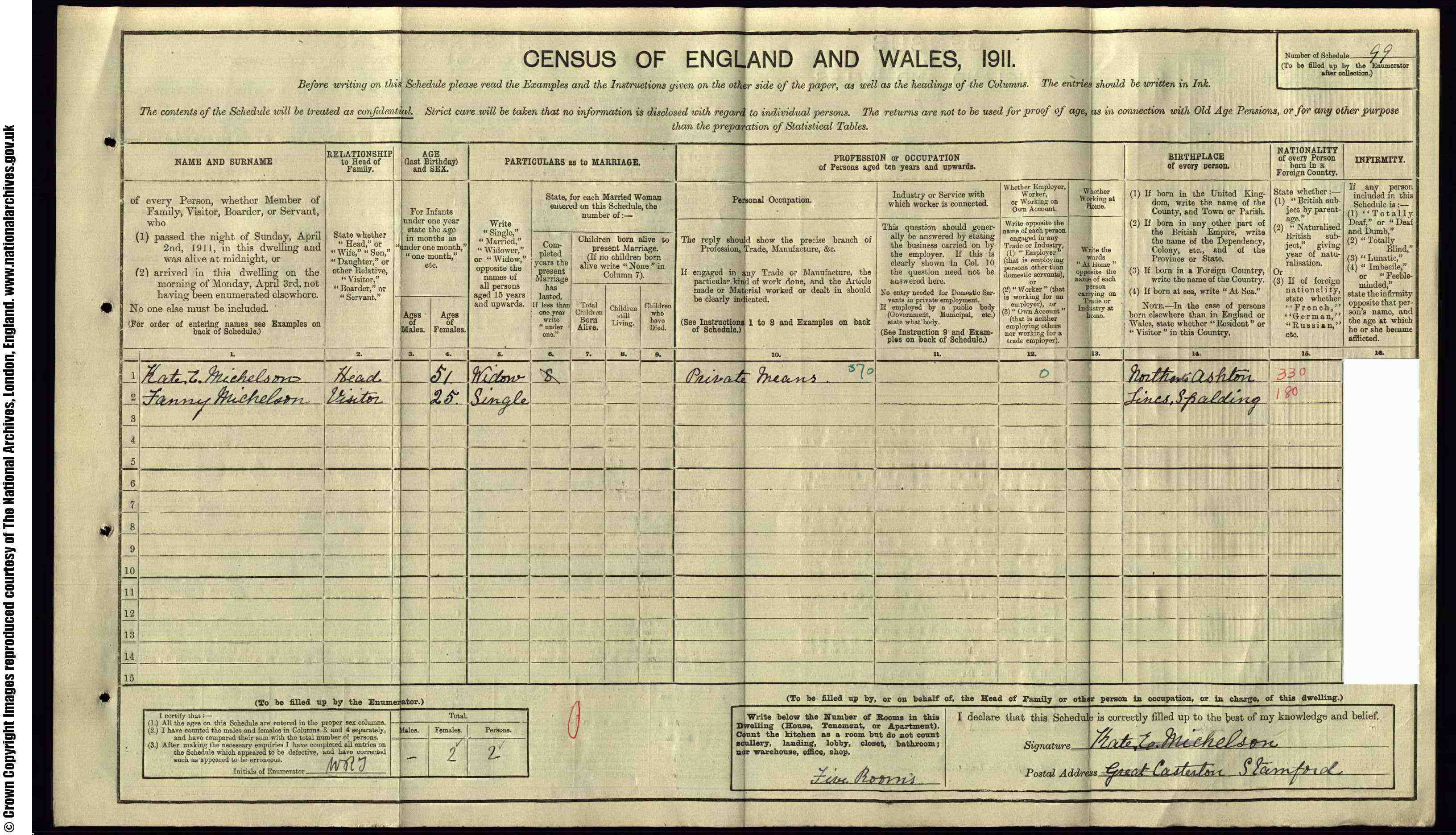 • Lived at: Road End, 1911, Little Castleton, Stamford. • Lived at: Little Casterton, 1920, Rutland. • Probate: 363 pounds, 7 Sep 1920, London. Kate married Richard Michelson on 15 Jul 1902 in Ufford, Stamford, , England.1 (Richard Michelson was born in Great Casterton and died before 1911.) |