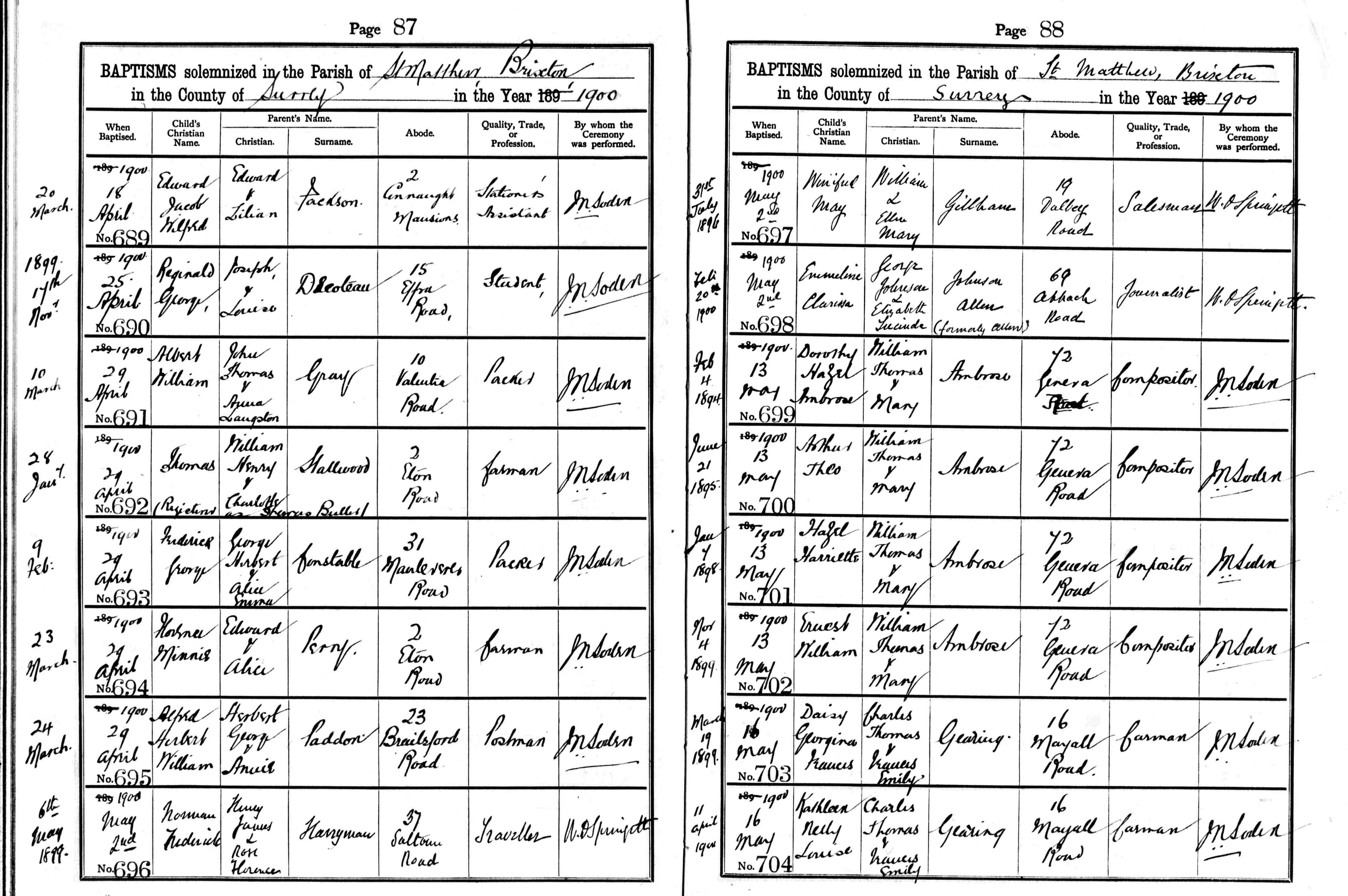 • Lived at: 12 Dalberg Road, 1921, Brixton, Surrey, England.