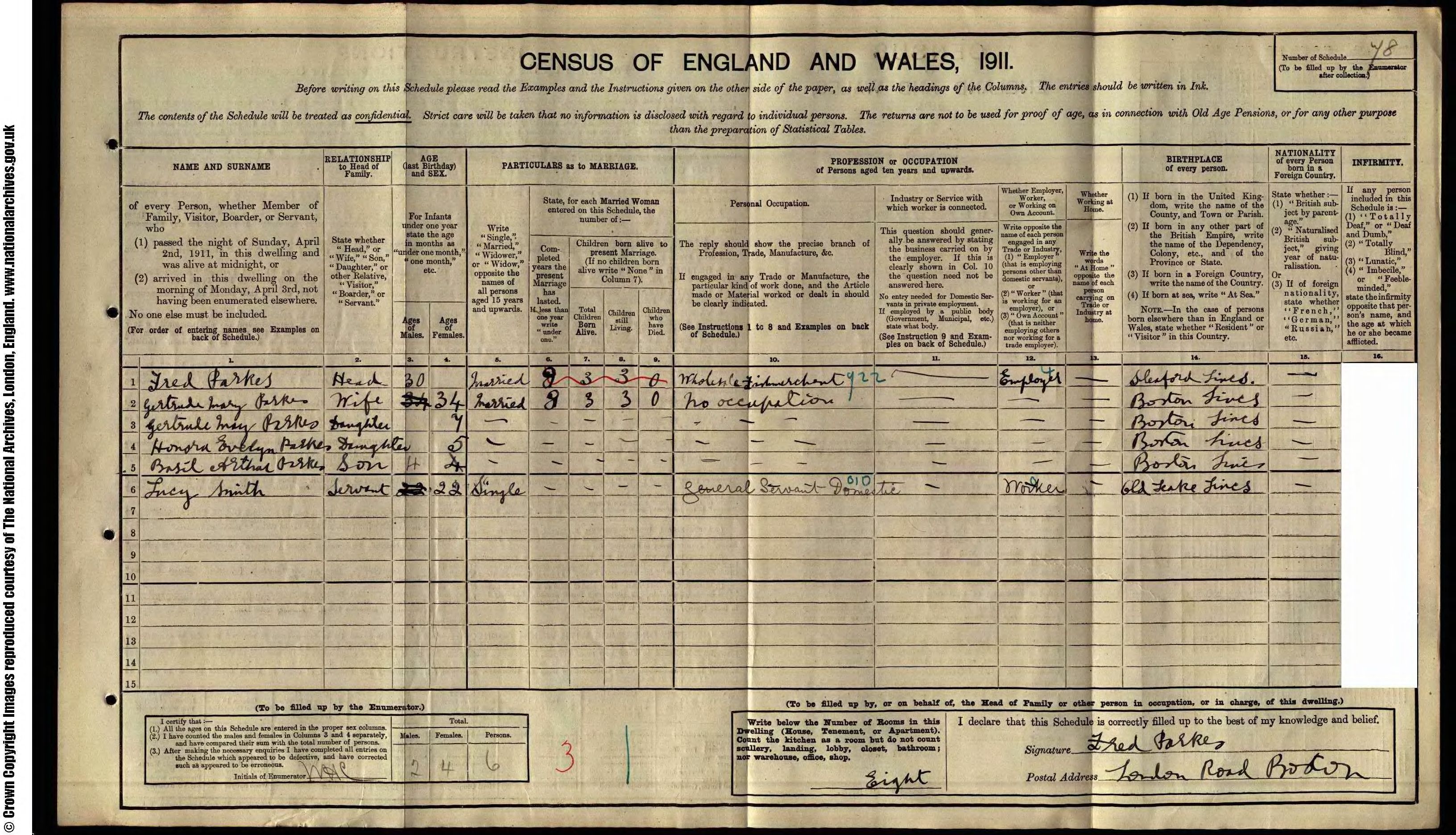 • Lived at: London Road, 1911, Boston, Lincolnshire, England.