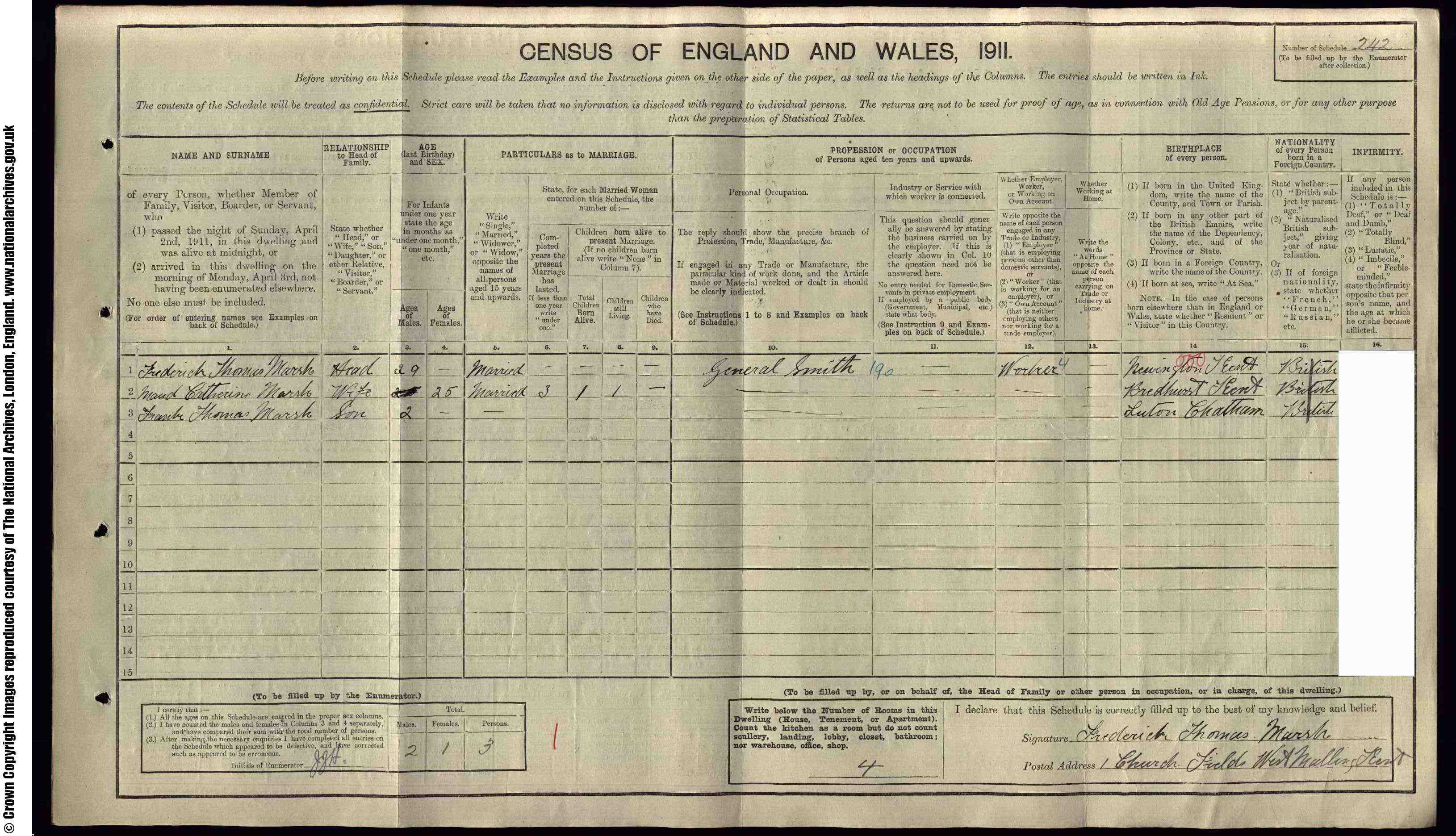 • Lived at: 1 Church Field, 1911, West Malling, Kent, England.
