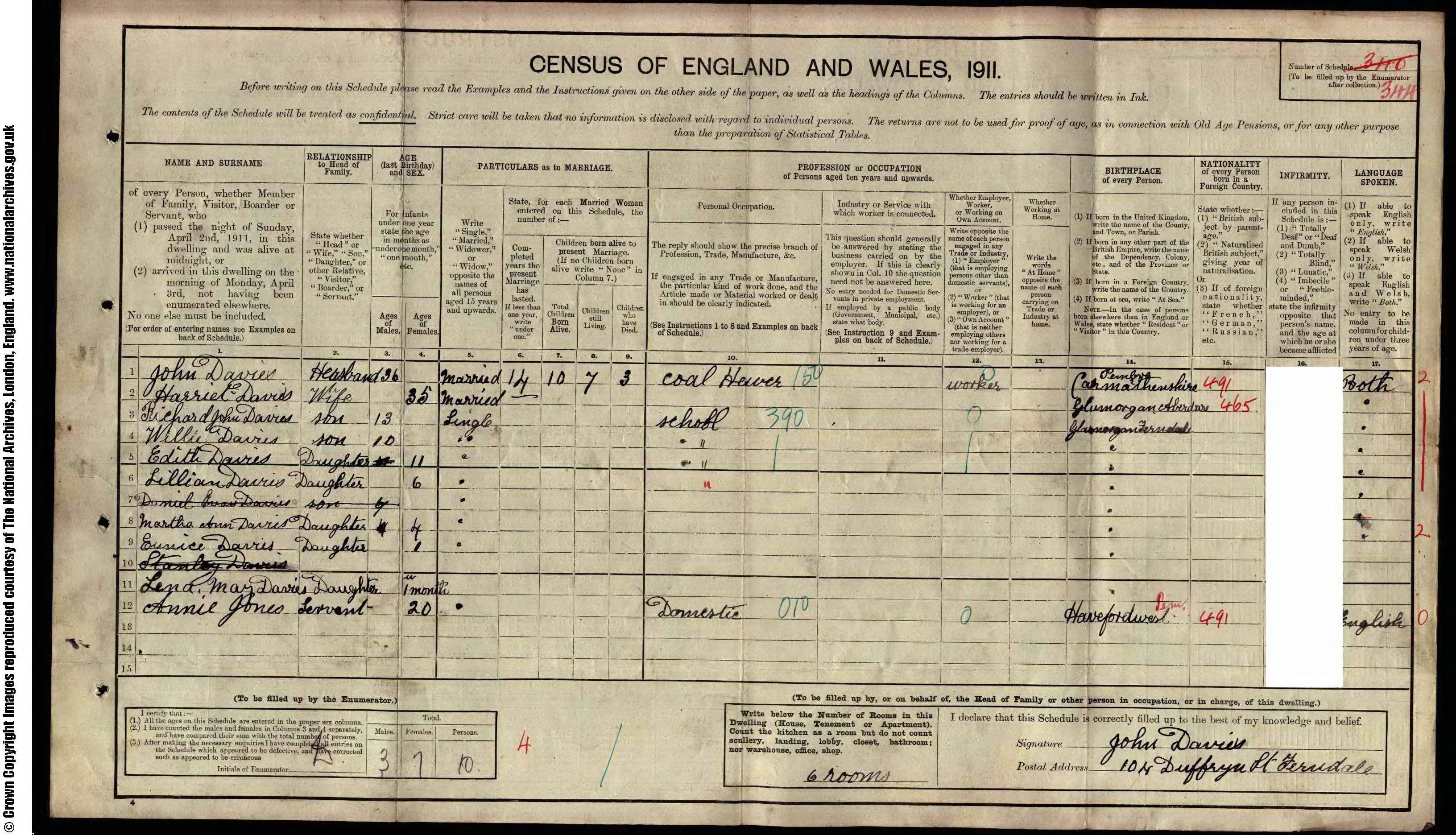 • Lived at: 104 Duffryn Street, 1911, Ferndale, Glamorgan.
