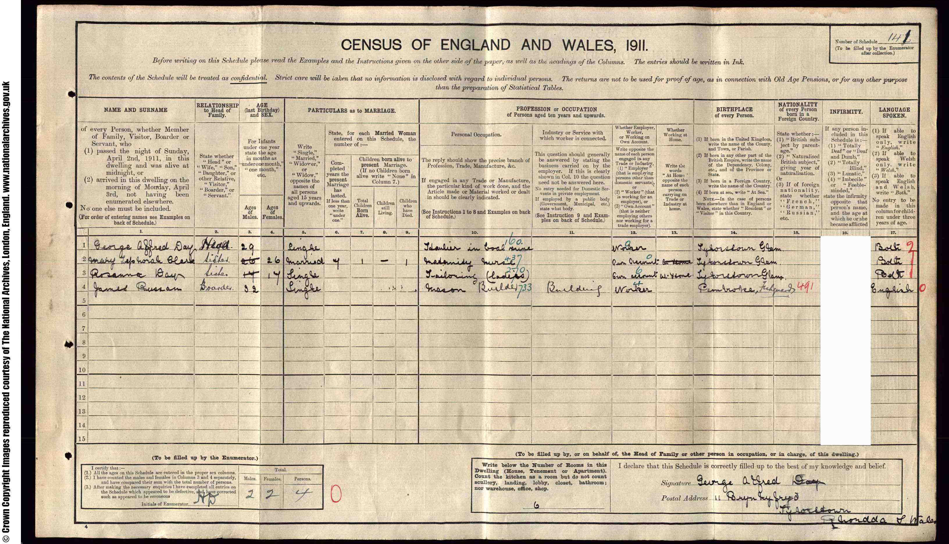 • Lived at: Bryn Field, 1911, Tylorstown, Ystradyfodwg, Glamorgan, Wales.