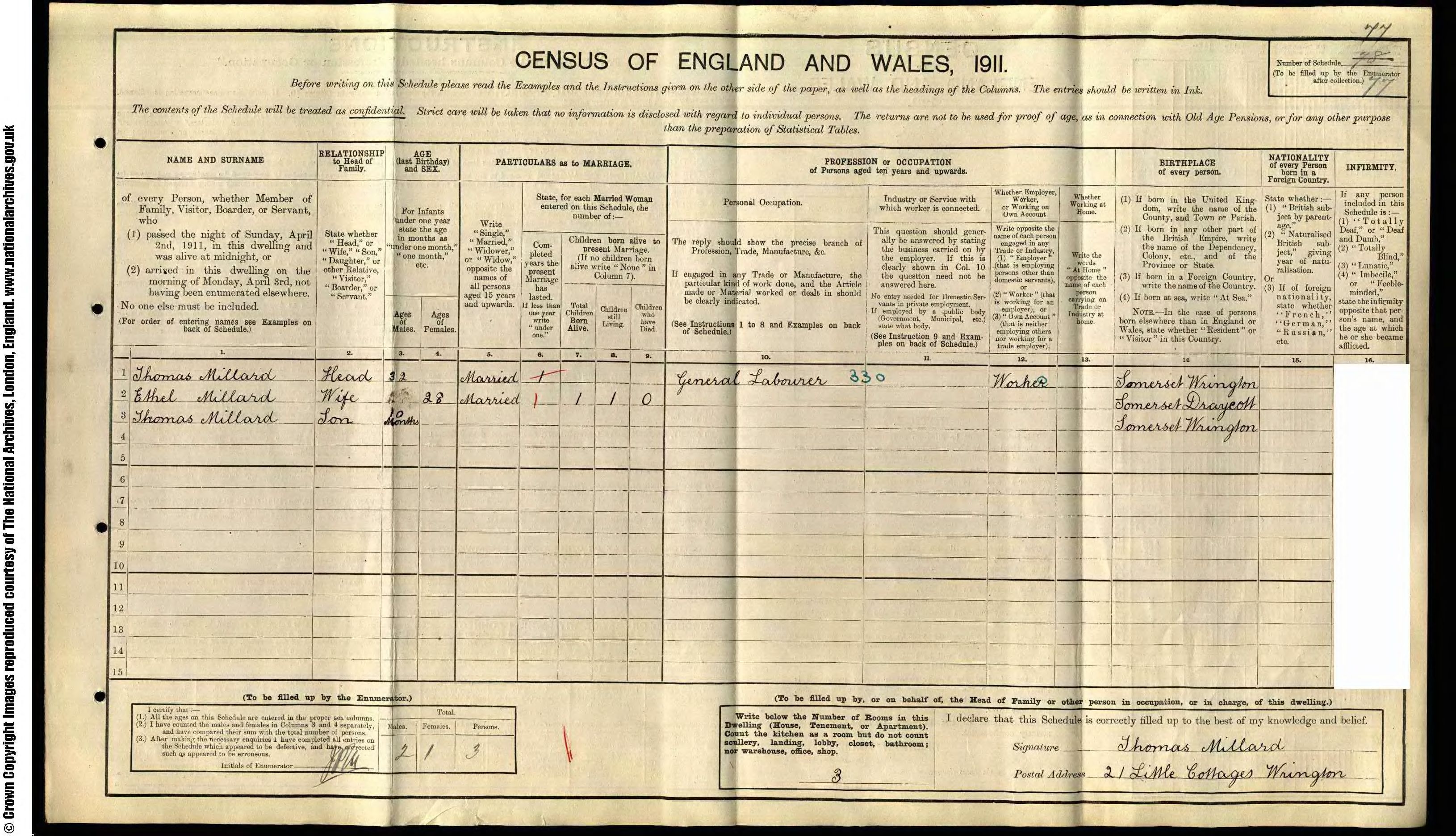 • Lived at: 21 Little Cottages, 1911, Wrington, Somerset, England.