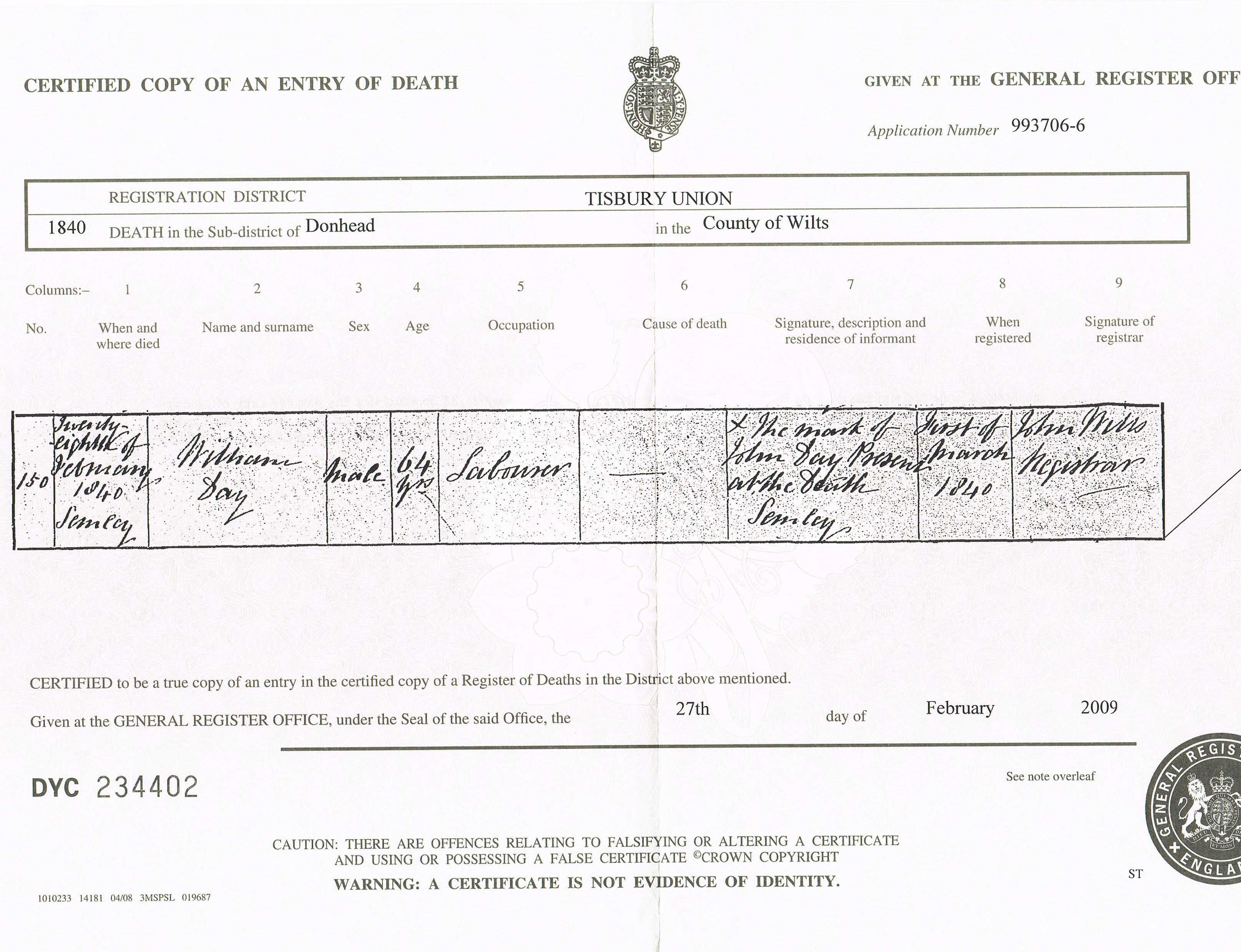 England and Wales, death certificate for William Day, died Twenty eighth Februrary; citing /150, March quarter 1840, Tisbury Union registration district, Donhead sub-district; General Register Office, Southport. Rec. Date: Jul 2008. ID: DC. Cit. Date: 9 Mar 2009. Cit. ID: DYC 234402, Surety: 4; 150