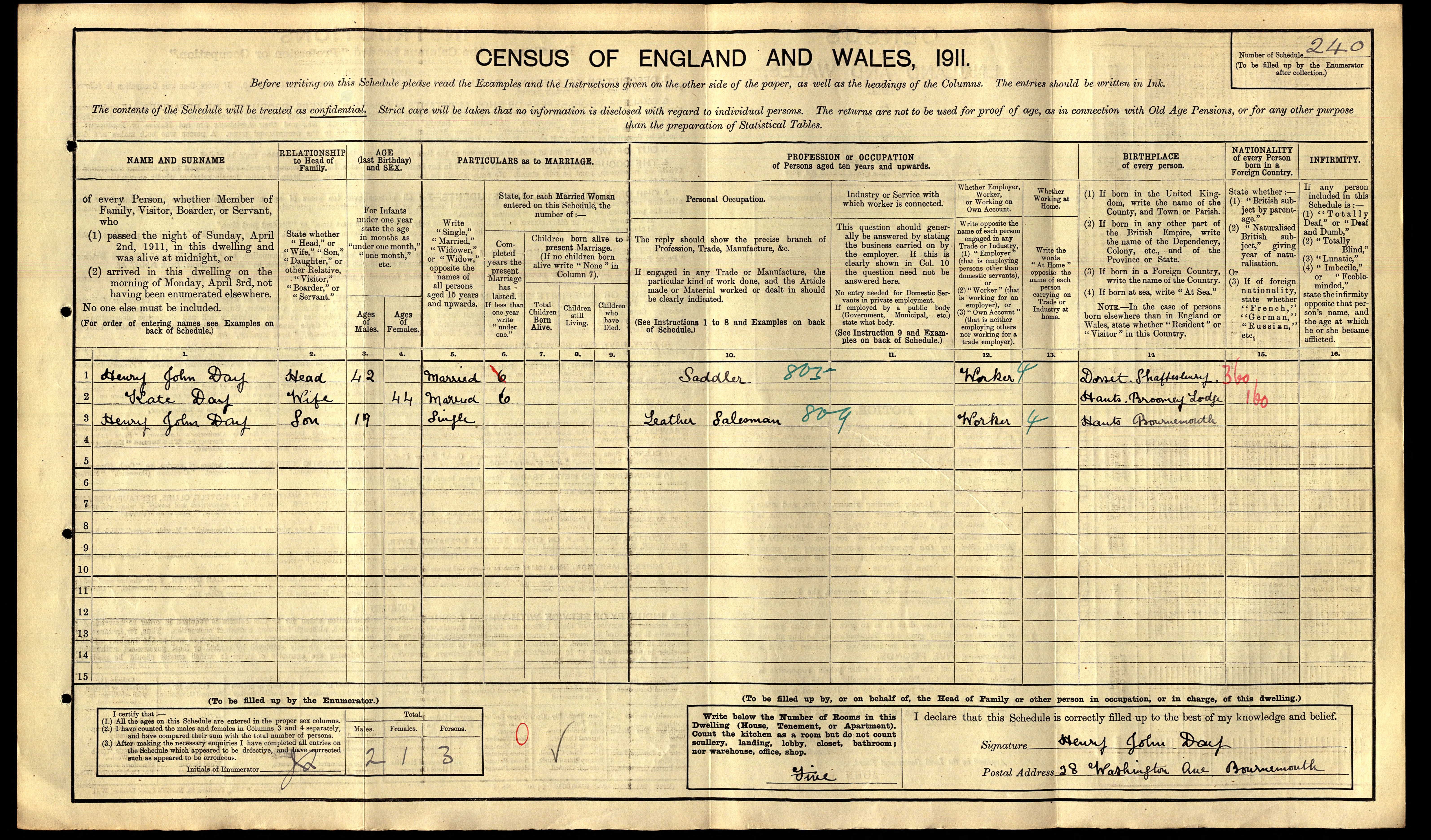 • Occupation: Saddler, 1911, Bournemouth, Dorset, England.