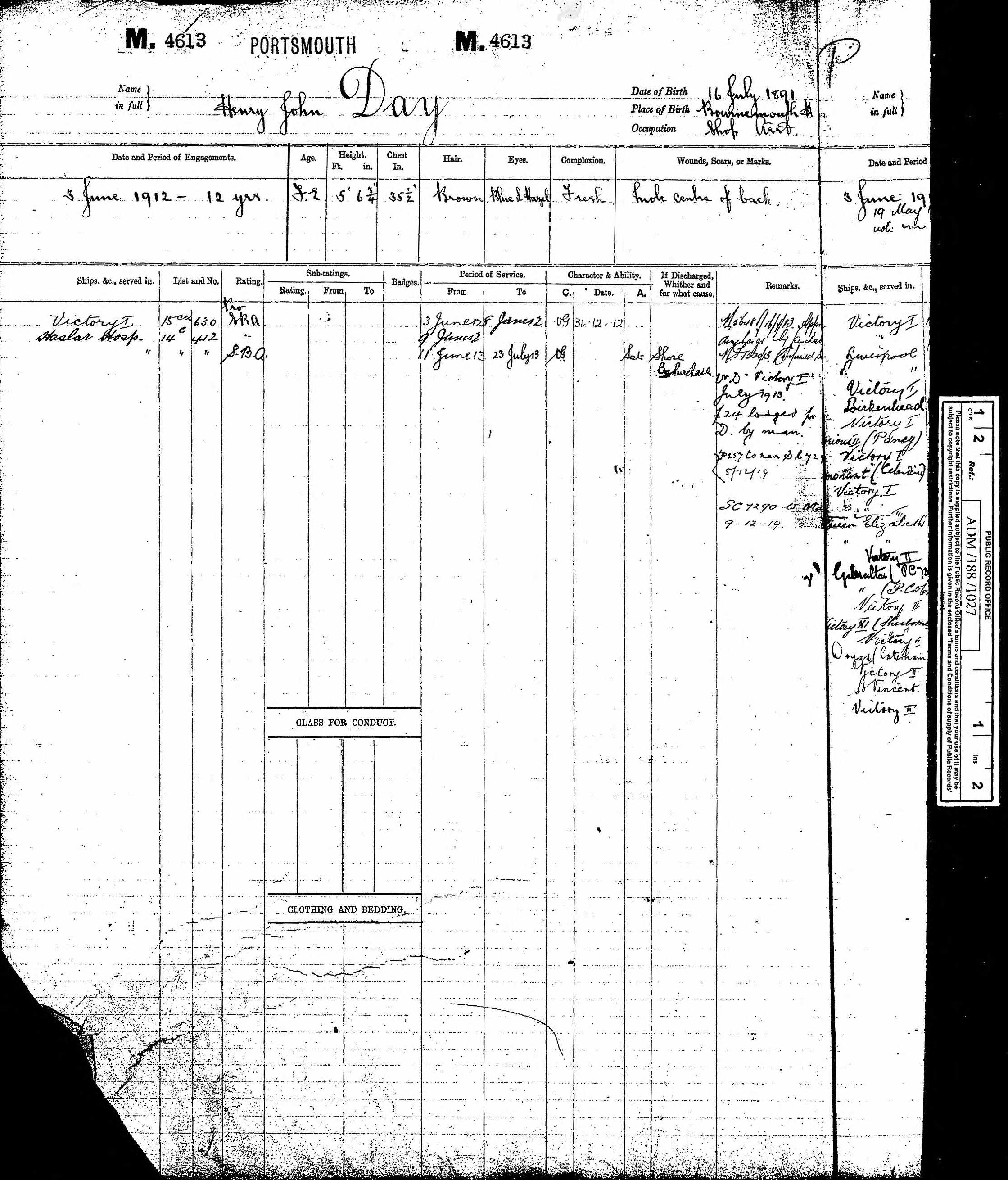 • Military: Royal Navy, 1912-1913, Portsmouth. Was briefly in Royal Navy, bought his discharge in 1913
