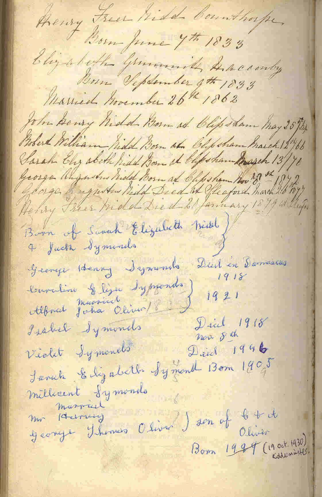 • Will: Admin, 18 Feb 1879, Llincoln. Elizabeth Nidd widow Henry married Elizabeth Grummitt, daughter of John Grummitt and Mary Chapman, on 26 Nov 1862 in Hacconby, Lincolnshire, England. (Elizabeth Grummitt was born on 9 Sep 1833 in Hacconby, Lincolnshire, England 3 4 and died on 21 Sep 1898 in Barnsley, Yorkshire, England, 4 12.) |