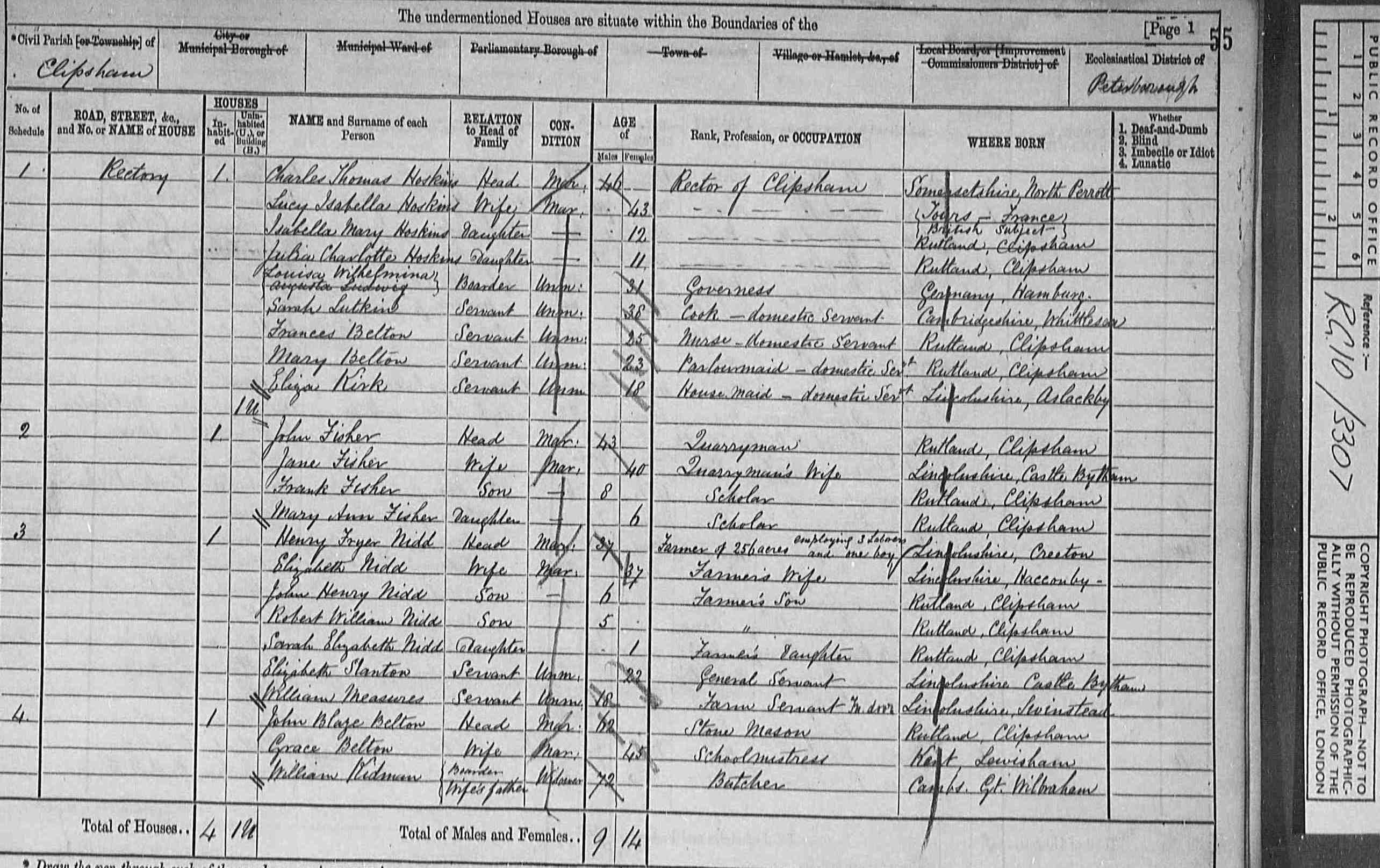 4 (1871 English and Welsh Census(London, TNA/Ancestry.co.uk, 1972) , Web site showing copies of original enumerator schedules) ID: CEN 1871, CEN 1871 3307 fol 55 page 1 Rectory Schedule 3. Repository: Not Given. Cit. Date: 25 Jul 2004. Cit. ID: CEN 1871 RG 10 3307 fol 55 page 1 Rectory Sch 3. Surety: 3.