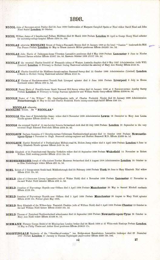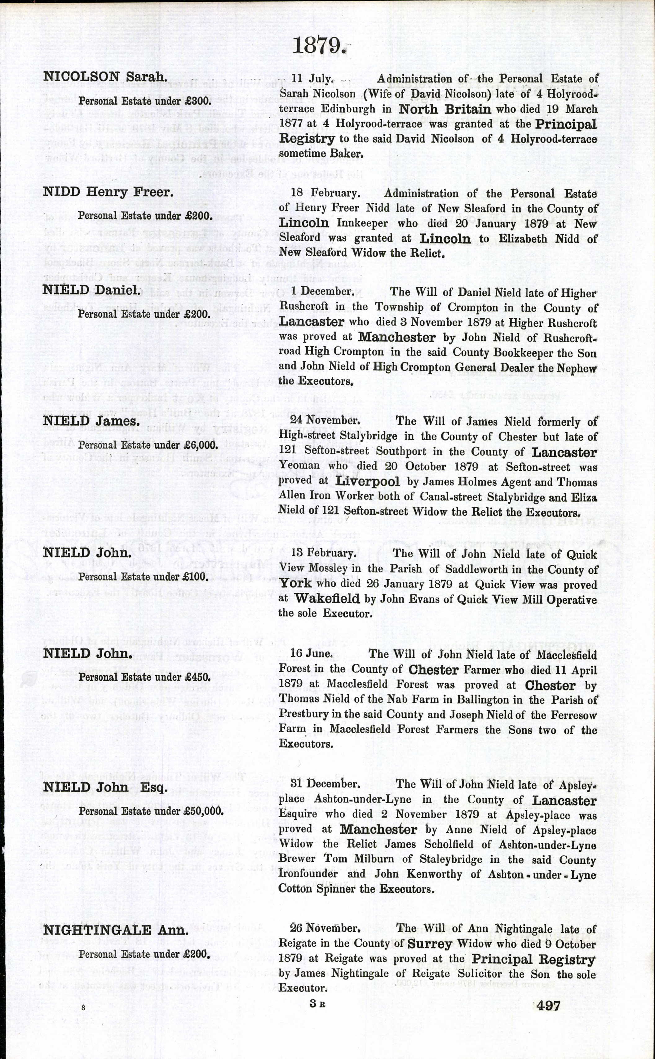 Findmypast.com, England & Wales, National Probate Calendar (Index of Wills and Administrations),1861-1941. Surety: 3. Nidd, Henry Freer, 18 feb 1879 Effects under 200pounds
