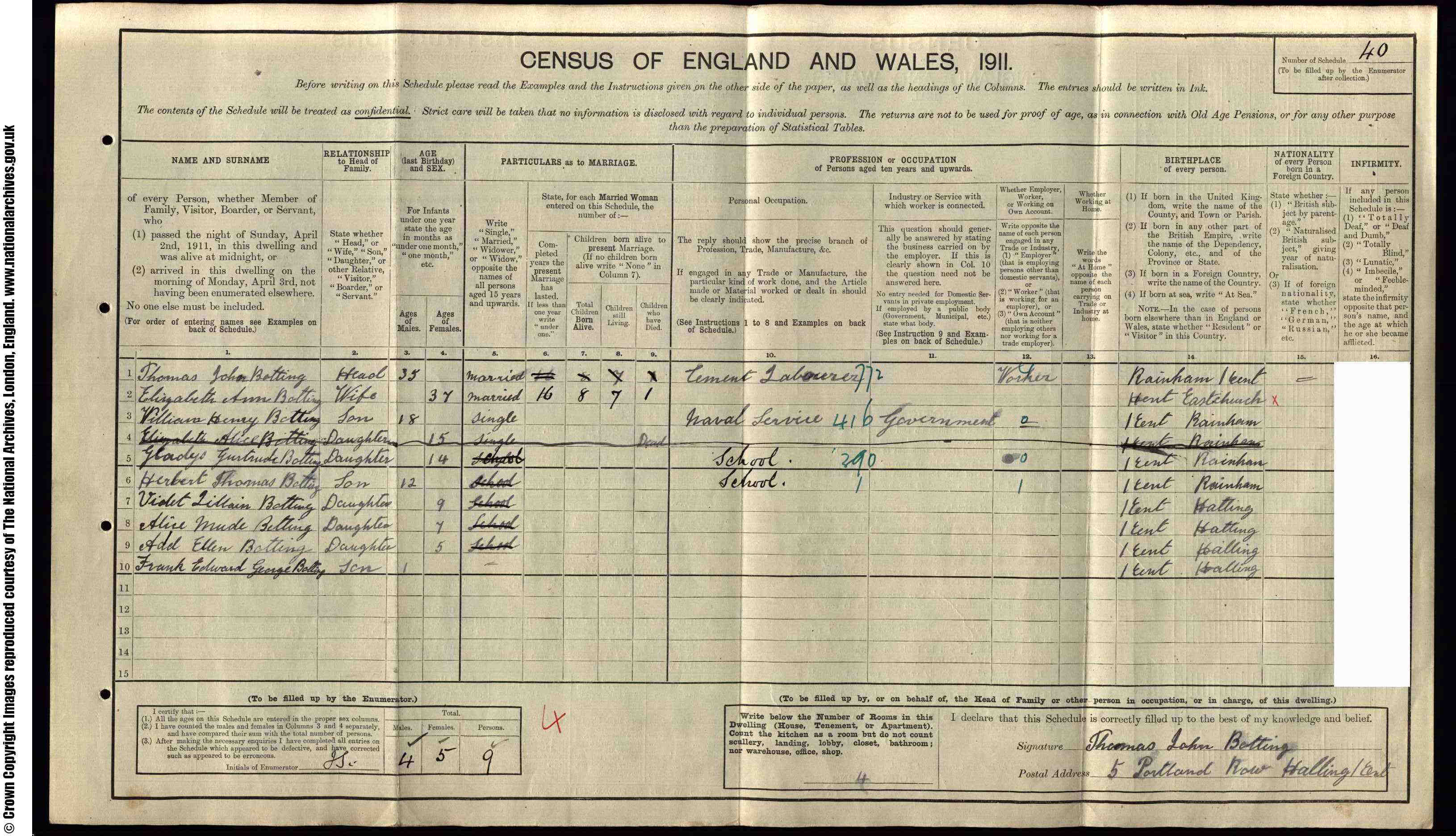 • Lived at: 5 Portland Row, 1911, Halling, Kent.