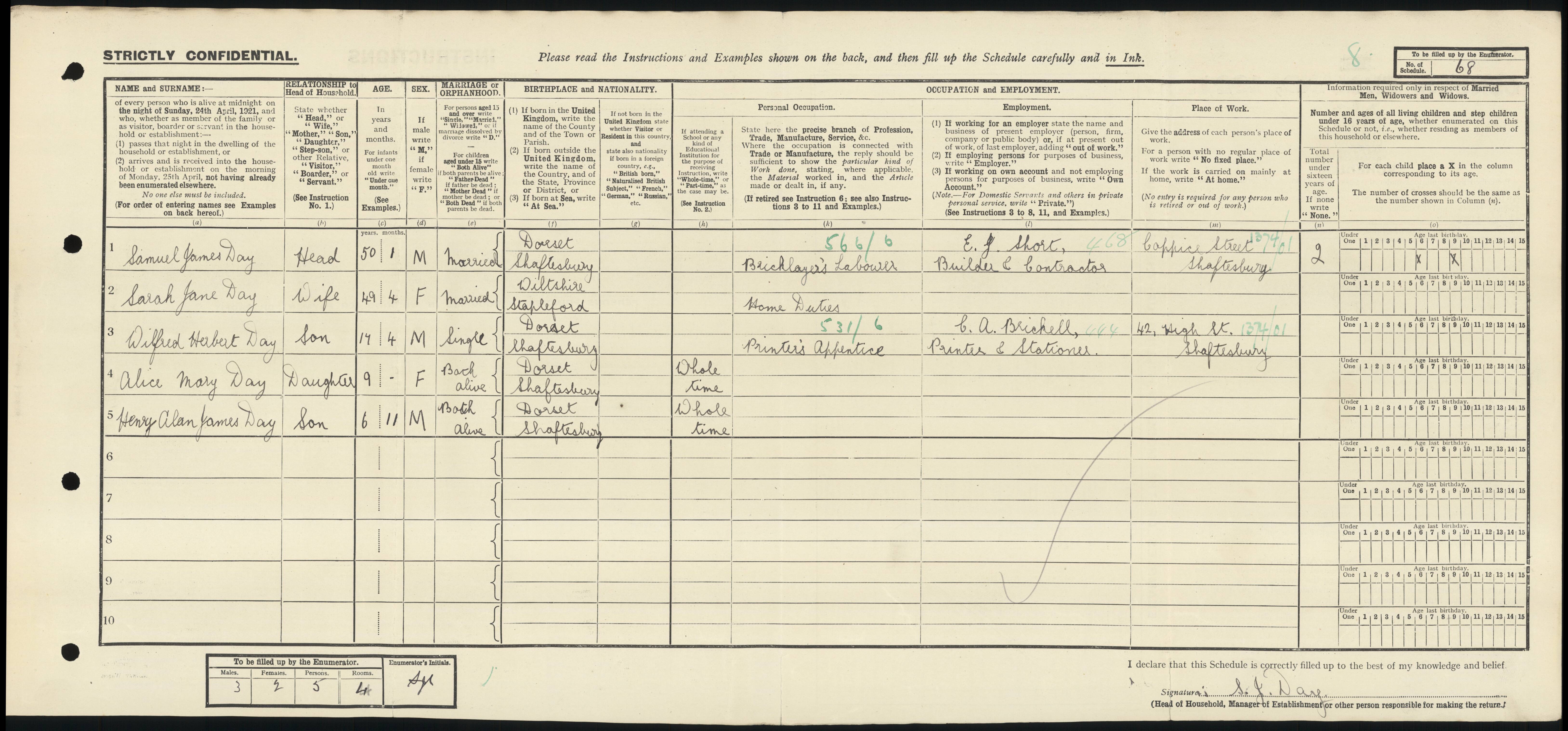 • Lived at: 14 Parsons Pool, 1921, Shaftesbury, Dorset, England. • Occupation: Printer's apprentice, 1921, Shaftebury. |