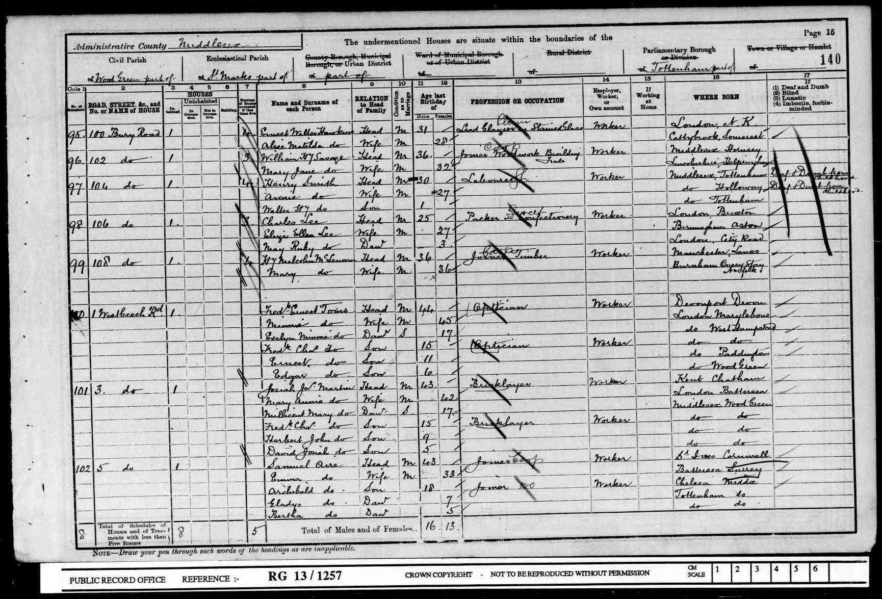 • Lived at: 102 Bury Road, 1901, Wood Green London.