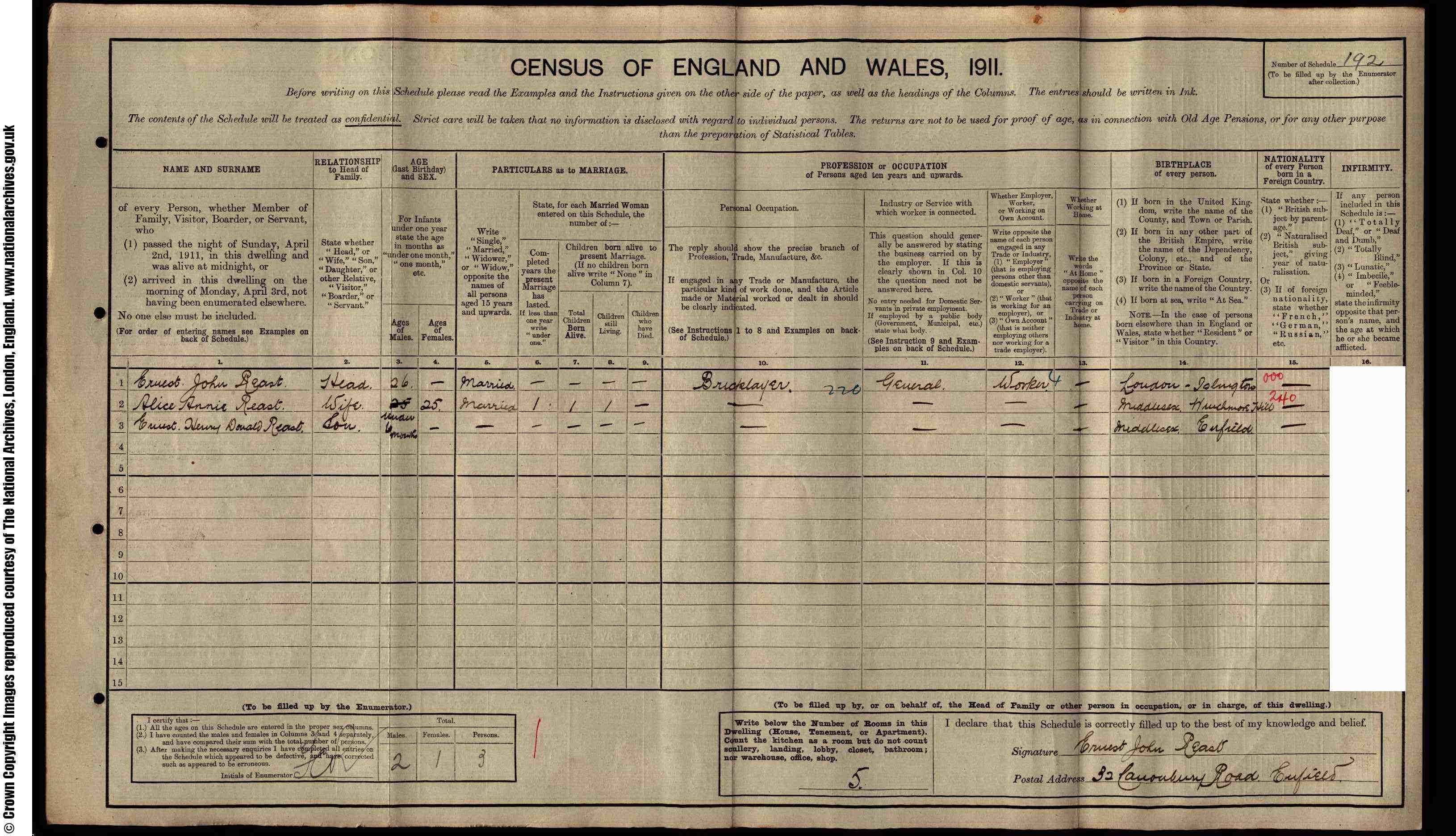 • Occupation: Bricklayer, 1911, Edmonton, Middlesex, England.