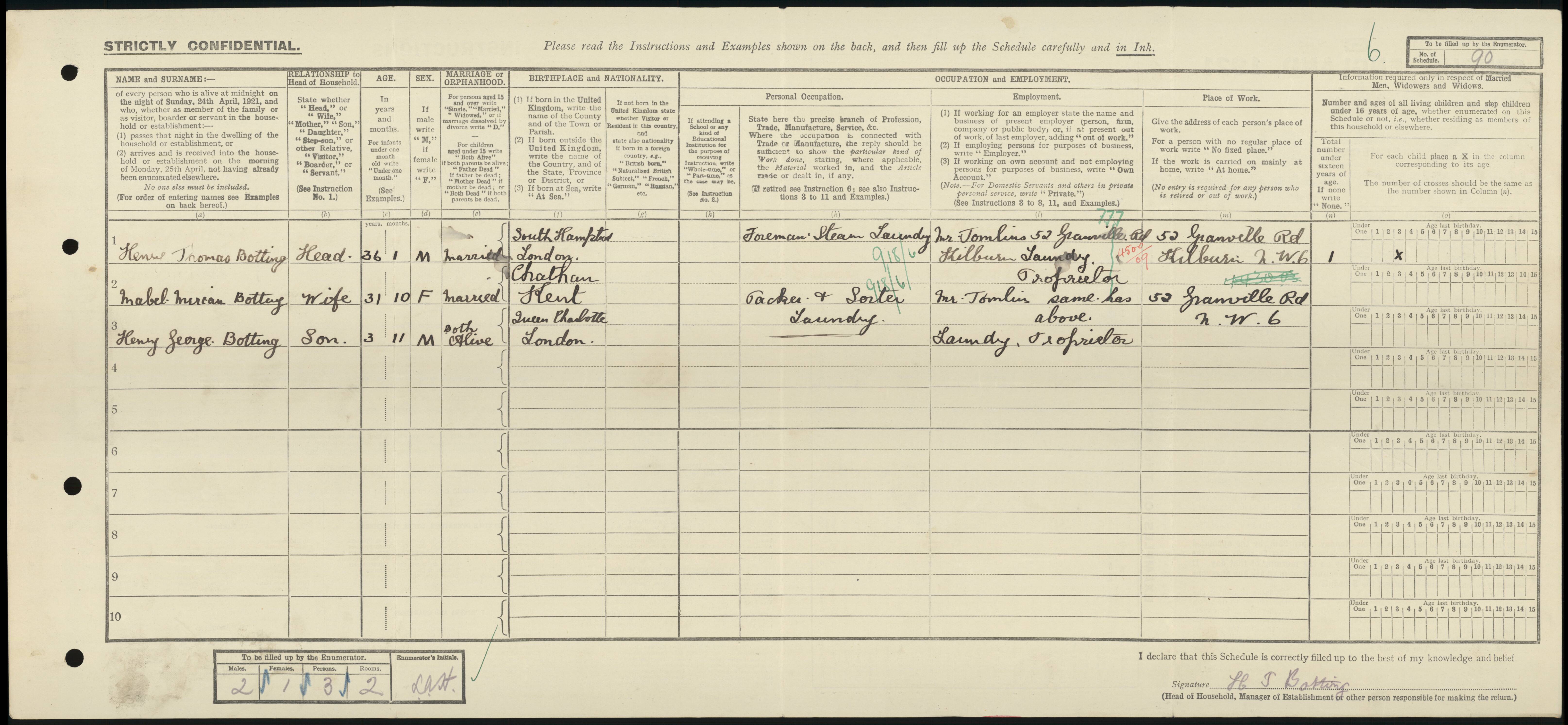 • Occupation: Foreman Steam Laundry, 1921, Kilburn, Middx. Employer : Mr Tomlins 52 Granville Rd Kilburn Laundry Propreitors