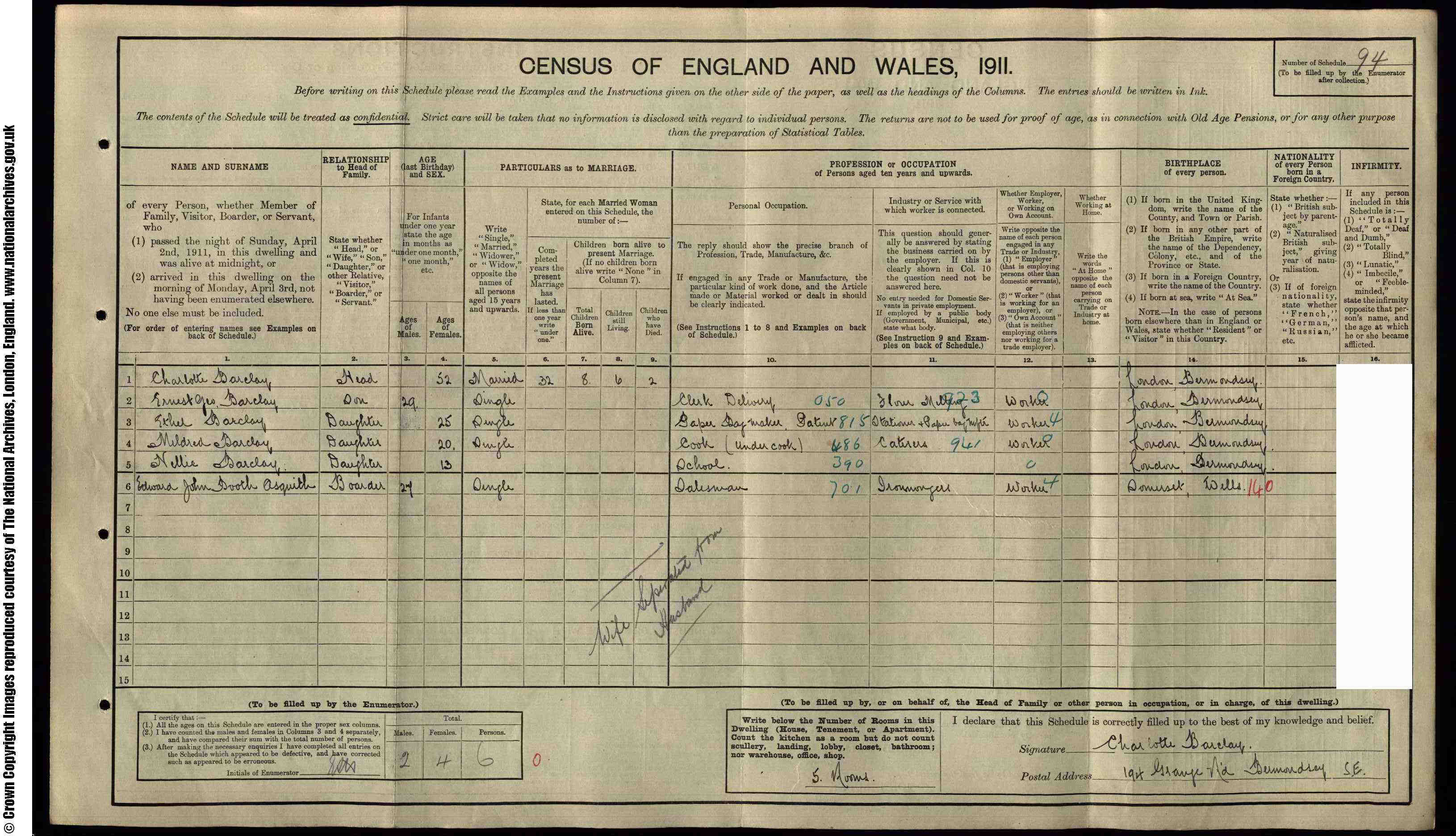 • Lived at: 200 Grange Road, 1921, Bermondsey, London & Surrey, England. First name(s) Edward John Booth Full address as transcribed 200 Grange Rd, Bermondsey Last name Asquith Parish Bermondsey Sex Male Registration district St Olave, Bermondsey Birth year 1883 Registration district number 24 Census date 19 June 1921 Sub-district Bermondsey Age in years 38 Sub-district number 1 Age in months 1 Enumeration district number 14 Age as transcribed 38 y 1 m County London, Surrey Relationship to head Head Country England Marital status Widowed Ward of borough or urban district Ward 2 Birth place Wells, Somerset, England Borough, urban or rural district Bermondsey MB Birth county Somerset Parliamentary borough or division Bermondsey PB, West Bermondsey Div. Birth country England Archive The National Archives Transcribed birth place Somersetshire, Wells Archive series RG 15 Occupation Builders Merchants Warehouse Clerk Piece number 01901 Occupation code 939 Schedule number 157 Occupation code with suffix 939/6 Schedule type code E Employer Messrs Pryke & Palmer Ltd, 40/41 Upper Thomas St, London, Ec4 District reference RD 24 RS 1 ED 14 Employer code 624 Schedule type England household, single page, 10 entries Place of work Builders Merchants Other household member's first name(s) - Number of minor dependants 0 Other household member's last name - Language used to complete form English Record set 1921 Census Of England & Wales Person making return Edward John Booton Asquith Category Census, Land & Substitutes House number 200 Subcategory Census Street Grange Road Collections from Great Britain, England Address 200 Grange Road © Findmypast