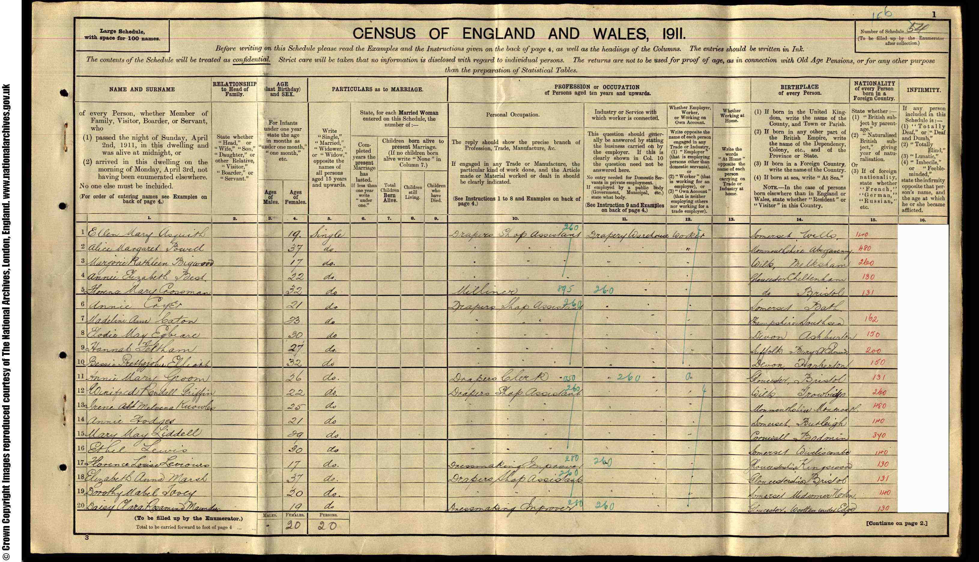• Occupation: Drapers Shop Assistant, 1911, Bath, Somerset, England.