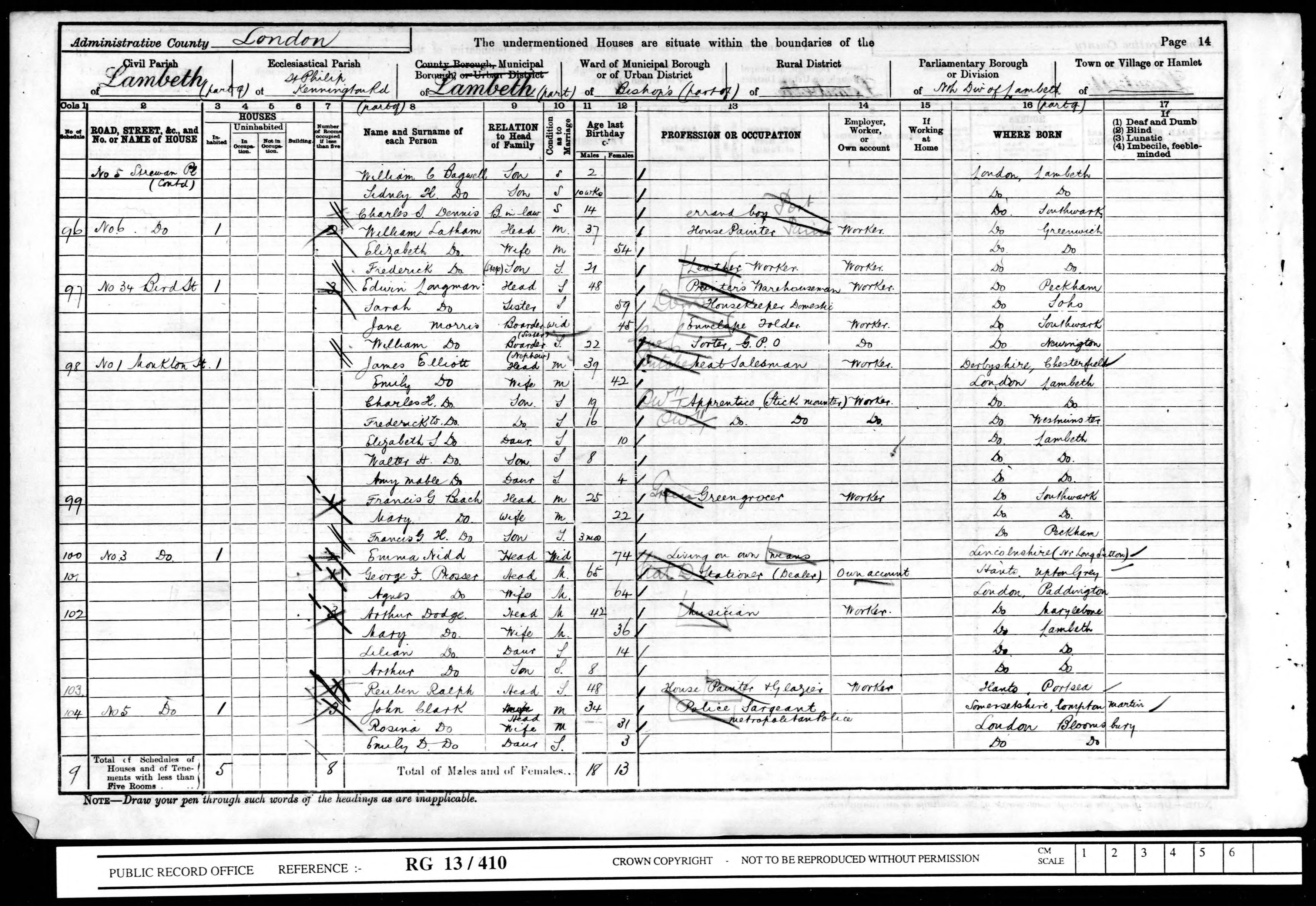 1 (1881 English and Welsh Census(London, TNA/Ancestry.co.uk, 1982) , Web site showing copies of original enumerator schedules) ID: CEN 1881, CEN 1881 RG 11 0598 15 14 Lambeth. Repository: Not Given. Cit. Date: 28 Jul 2004. Cit. ID: CEN 1881 RG 11 0598 15 14 Lambeth. Surety: 3.