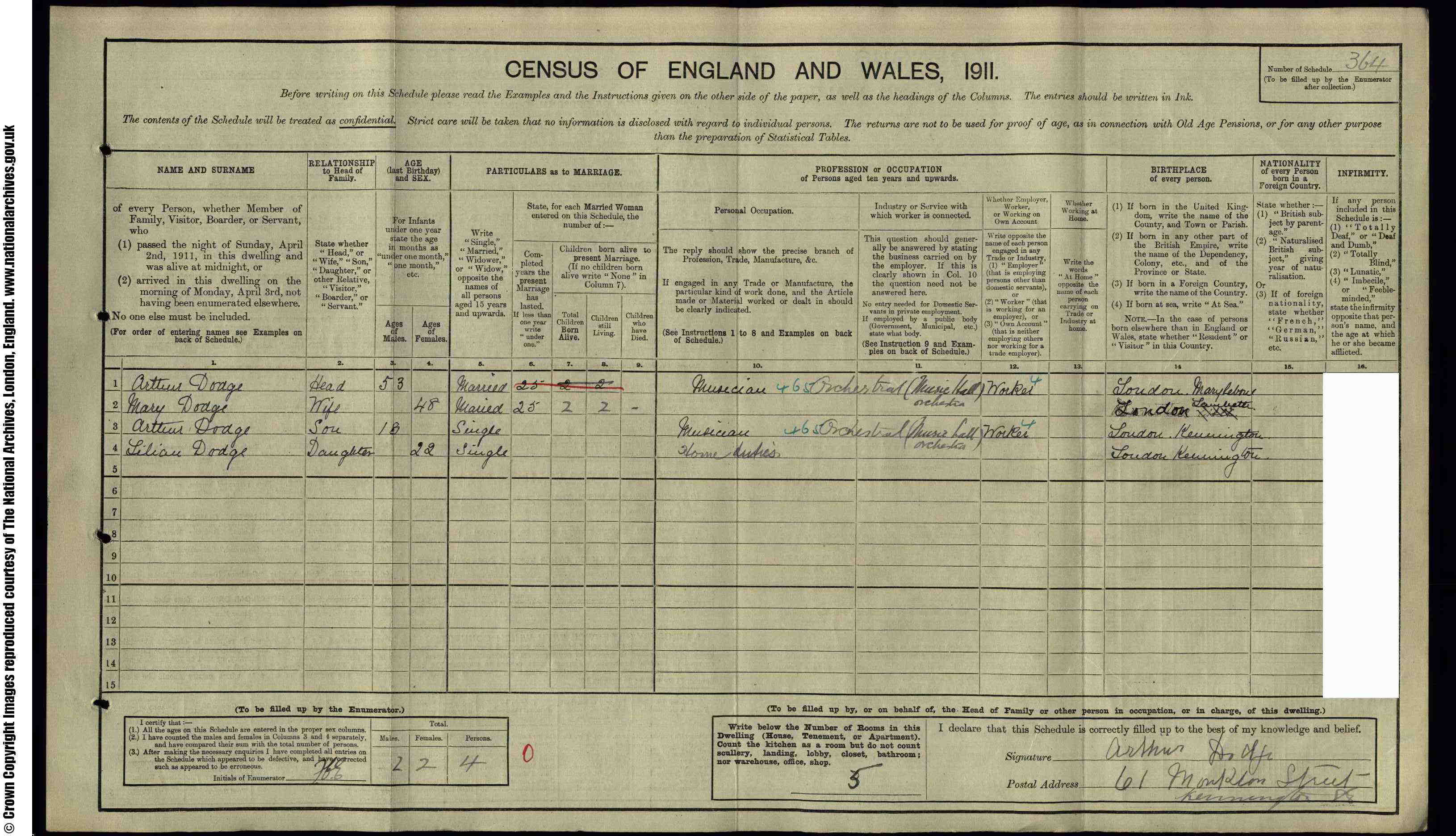• Lived at: 61 Monkton Street, 1911, Lambeth, London, England. Mary married Arthur Oliver Dodge on 21 Nov 1885 in St. Philip, Lambeth, London, England. (Arthur Oliver Dodge was born on 12 Feb 1858 in London, England 3, baptized on 26 Apr 1864 and died Jun Q 1930 in Hammersmith, Middlesex, England 3.) |