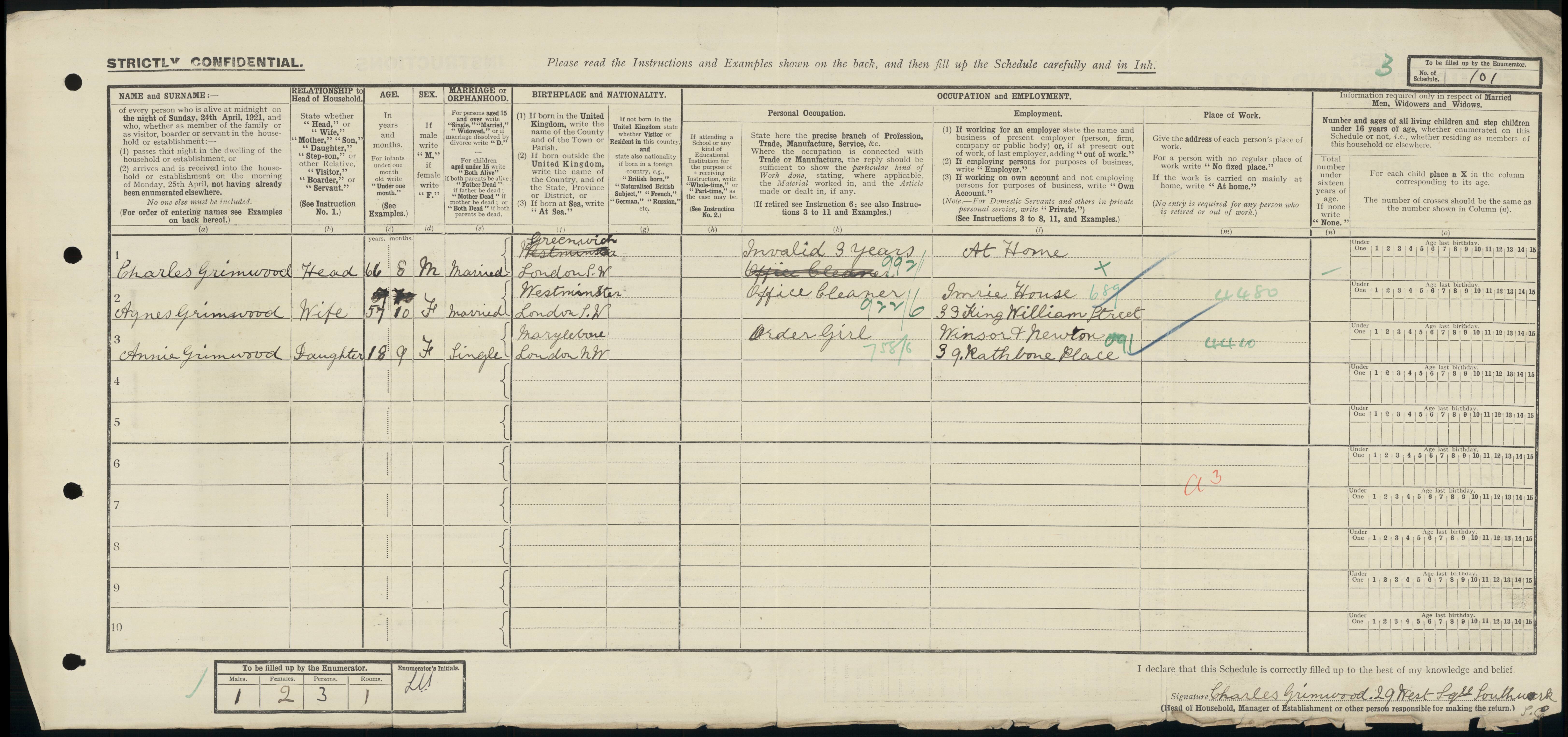 • Occupation: Order Girl, 1921, London. working for Winsor and Newton, 39 Rathbone Place