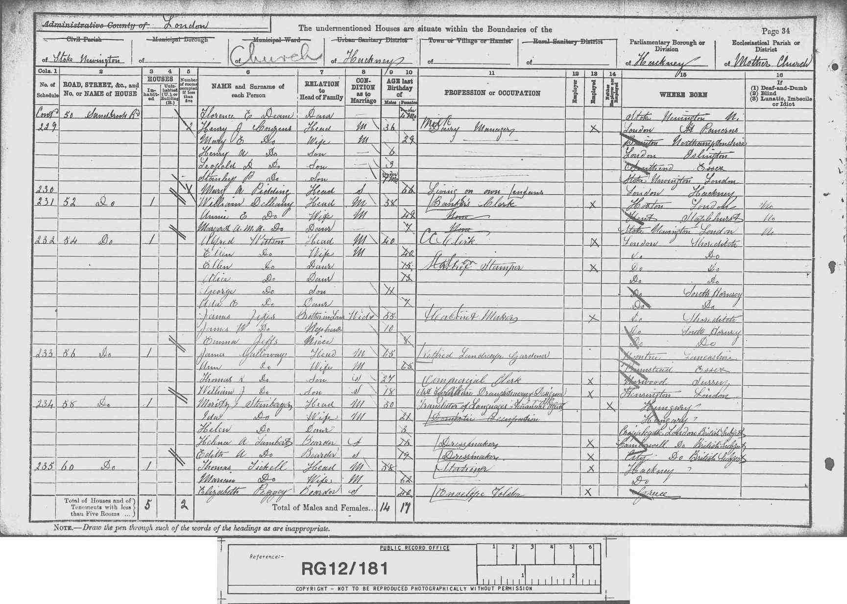 • Lived at: 50 Sandbrook Road, 1891, Stoke Newington, London.