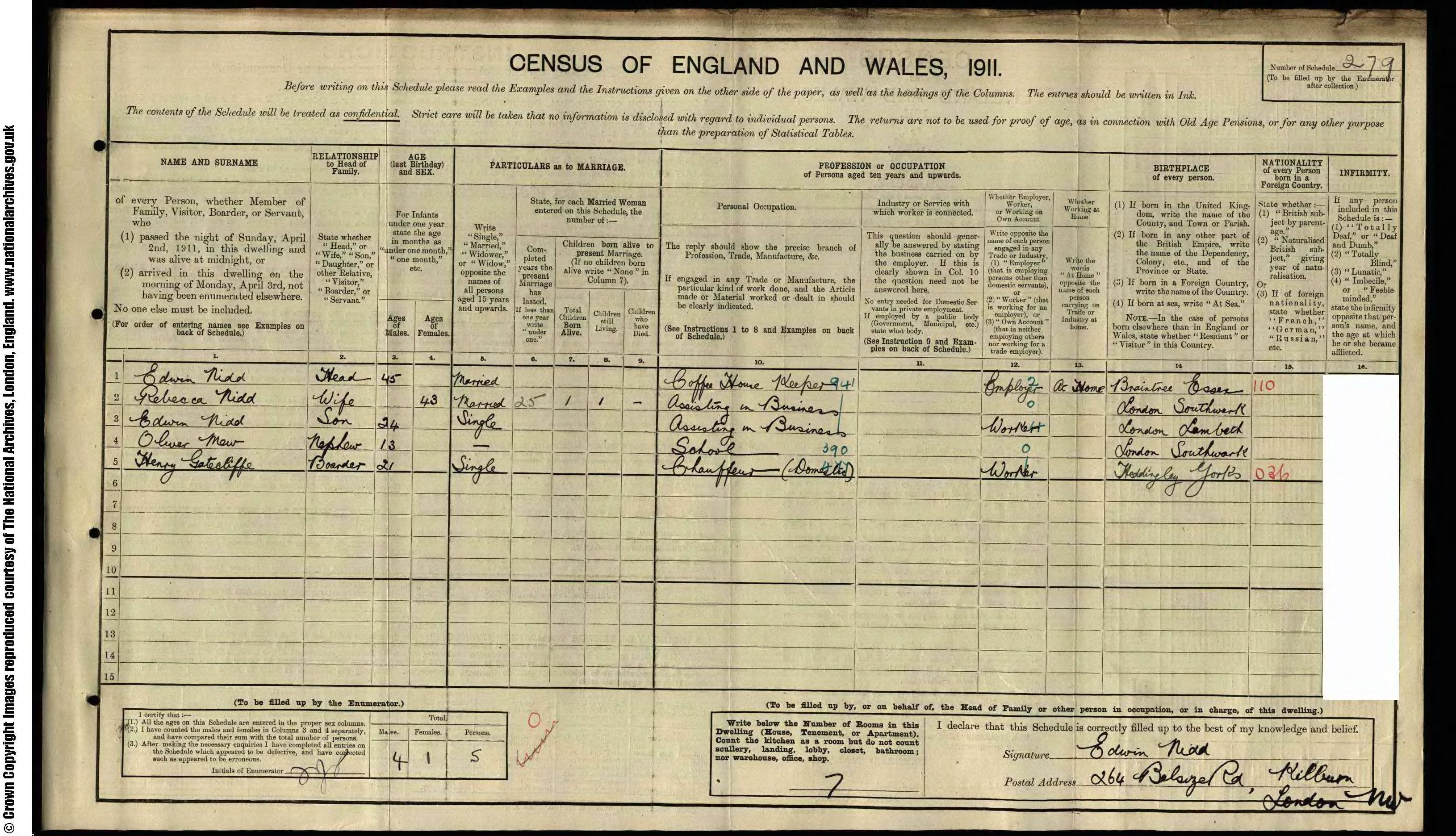 • Lived at: 264 Belsize Road, 1911, Kilburn, Middx.