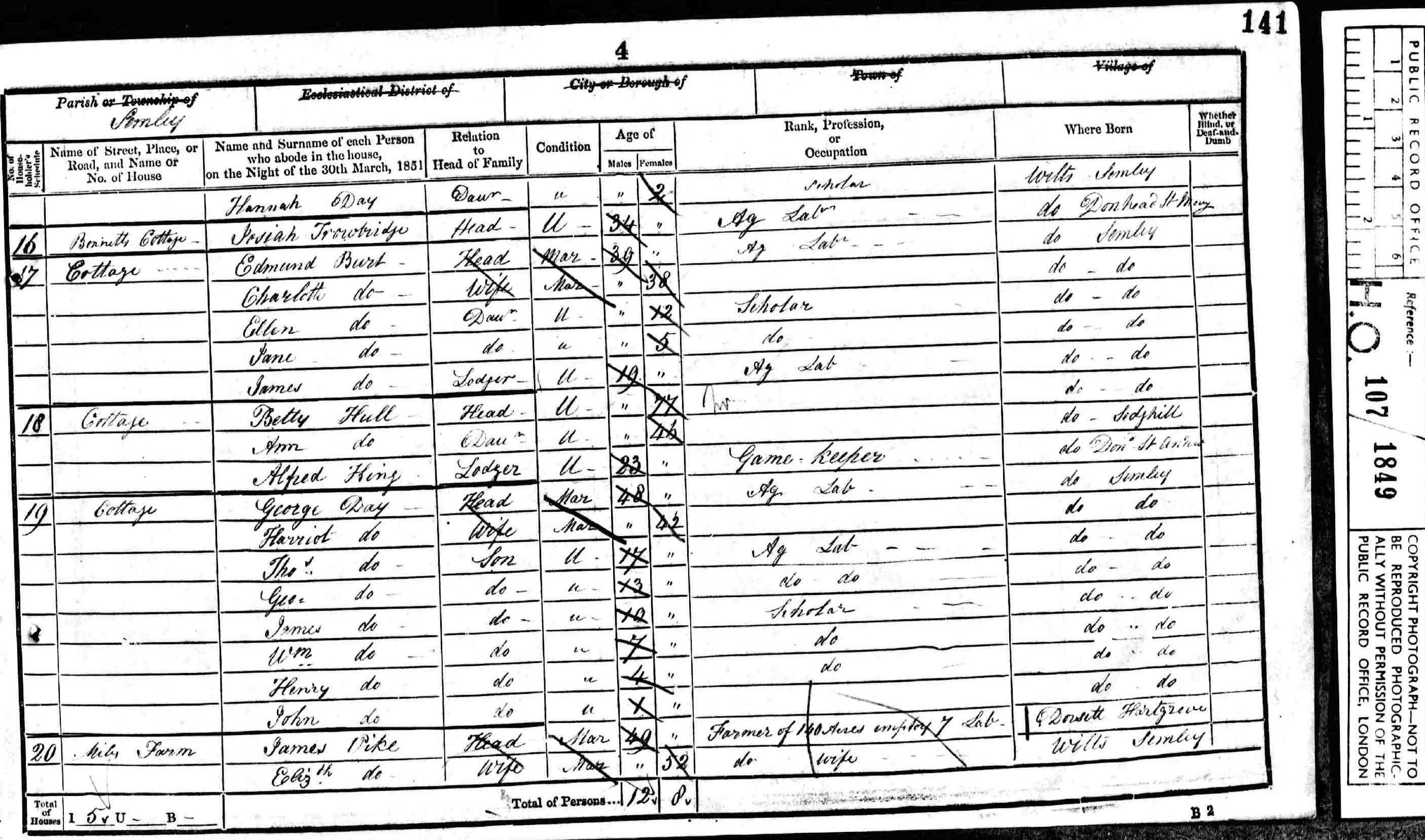 • Lived at: Cottage, 1841-1851, Semley, Wiltshire, England. 8 • Occupation: Ag Lab, 1841, Semley, Wiltshire, England.
