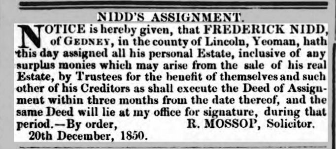 • Newspaper Article: assignment of assets, 1850, Gedney, Lincolnshire, England. • Lived at: Gedney Dyke, 1851, Gedney, Lincolnshire, England. 9