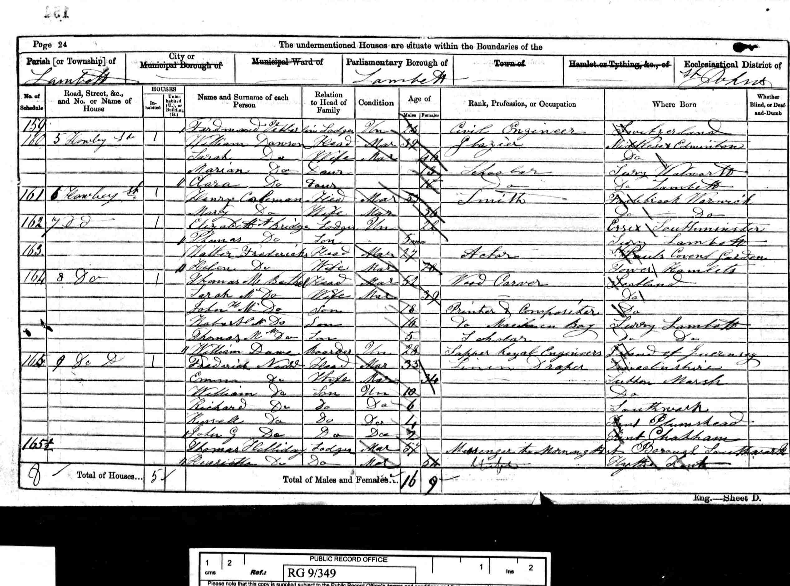 11 (1881 English and Welsh Census(London, TNA/Ancestry.co.uk, 1982) , Web site showing copies of original enumerator schedules) ID: CEN 1881, CEN 1881 RG 11 0598 15 14 Lambeth. Repository: Not Given. Cit. Date: 28 Jul 2004. Cit. ID: CEN 1881 RG 11 0598 15 14 Lambeth. Surety: 3.