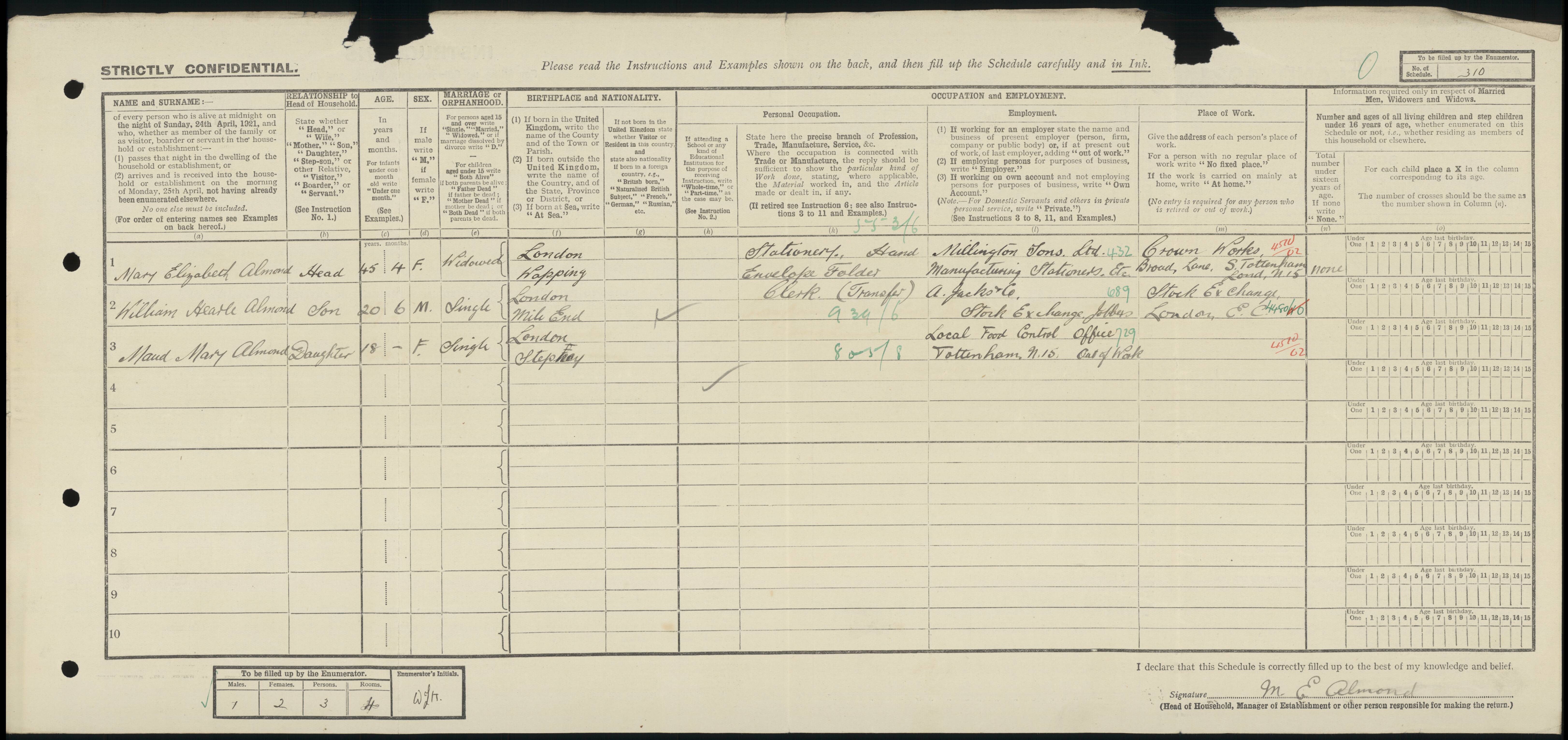 • Occupation: Envelope Folder, 1911-1921, Camberwell, Surrey, England.